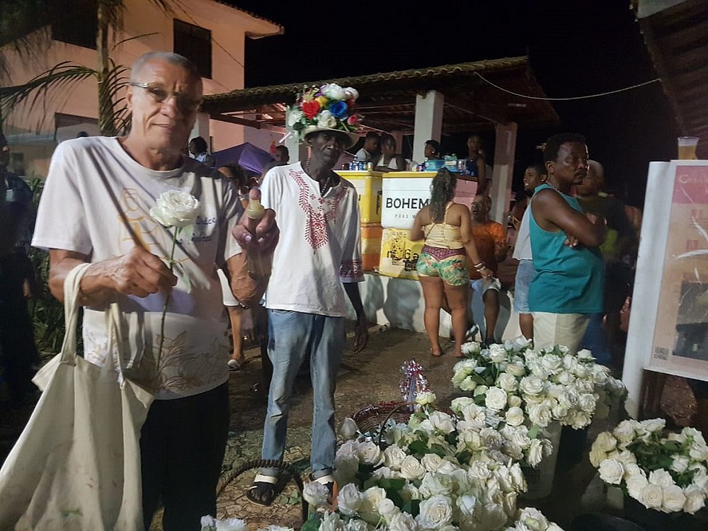 Seu Renato vende flores na festa de Iemanjá há mais de 40 anos. Mal tinha virado meia-noite metade das rosas já estavam vendidas